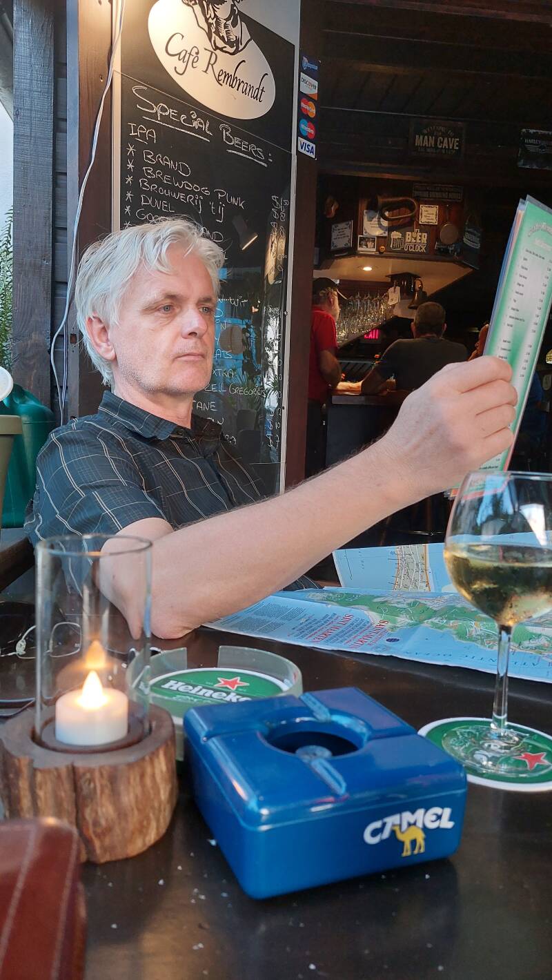 Een ontdekking die we eerder deze week deden: Café Rembrandt. Stel je een serie valse (en lelijke) trapgeveltjes voor, met in het midden ervan een bruine bar met terras. Eigendom van een Nederlander en een Belgische, die na de nodige omzwervingen over de wereld op Sint Maarten geland zijn. De bierliefhebber kan er uitstekend terecht, de bierkaart is minstens zo uitvoerig als die van het betere café in Amsterdam. Naast het café is een snackbar, eigendom van een andere Nederlander. Wie in het café behoefte krijgt aan (bijvoorbeeld) bitterballen kan dat kenbaar maken, en als de snackbareigenaar er is, zorgt die ervoor dat ze even later voor je neus staan. Wij hielden het noodgedwongen bij warme gehaktballetjes, omdat de snackbareigenaar erg laat was en zijn zaak nog niet geopend had (en toen hij aankwam te smerig was om aan te vatten, geen idee wat hij had uitgevoerd); in dat geval wordt in het café alleen eten geserveerd dat in de magnetron opgewarmd kan worden: gehaktballetjes, kipsaté, braadworst en rookworst. We hadden overigens ook voor zuurkoolstamppot kunnen gaan, die is eerder in de snackbar klaargemaakt en kan in de magnetron opgewarmd worden – maar om de één of andere reden past dat toch niet helemaal bij een temperatuur van 30 graden (dat Peter voor ergens komende week stoofpot als avondeten besteld heeft, vermeld ik nu natuurlijk even niet).