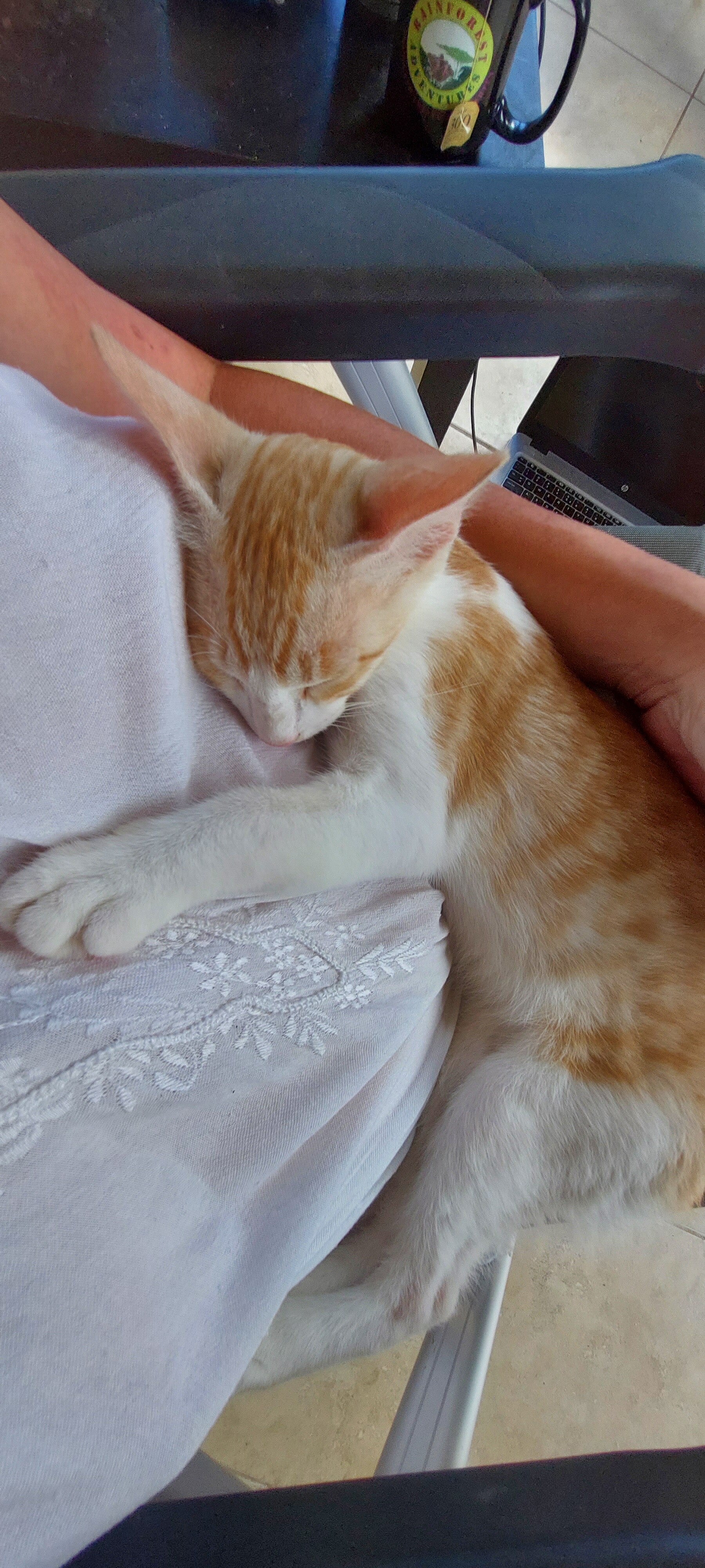 Afgelopen maandag is het gewone leven teruggekeerd: Peter gaat naar school en ik zit op de veranda met mijn laptop op schoot vanuit huis te werken. Dat werken vanuit huis is sinds gisteren wat minder eenzaam dan normaal, met dank aan Charlie. Toen ik gisterochtend buiten kwam, zat hoog in de boom voor de veranda een jong en mager katje niet echt goed meer te weten hoe-ie nou heelhuids weer naar beneden moest. Ik was er nog niet aan toegekomen me af te vragen of ik een ladder moest gaan zien te regelen toen ik hetzelfde katje over het hek rond onze tuin zag komen. Klaarblijkelijk was het gelukt om vanuit de boom naar beneden te komen en klaarblijkelijk was het ook gelukt om vervolgens over het ca. twee meter hoge hek te klimmen. Schuw was ’t beestje geenszins, hij liet zich maar al te graag aanhalen. Een schoteltje melk bliefde hij wel, en dat hij wel wist hoe hij op mijn schoot moet springen, bleek ook snel.